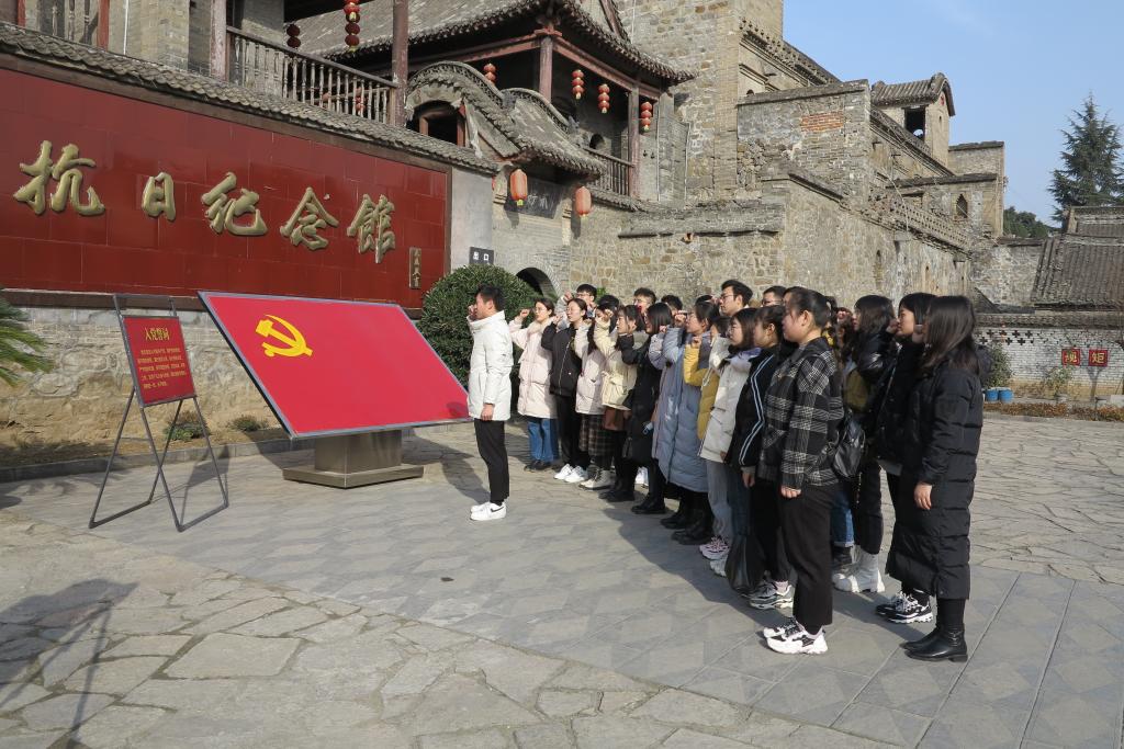 第一站,同志们来到河南省巩义市新中镇的豫西抗日纪念馆,在这片八路军豫西一支队与日寇浴血战斗的土地上,院团委副书记、研究生第二党支部书记郑开元同志带领各位同志面对党旗庄严宣誓,声音铿锵有力,誓词久久回荡,这是对于我党的赤胆忠诚和庄严承诺。接下来,在讲解员的带领下,大家开始有序的参观学习,纪念馆通过展现豫西抗日根据地开辟、巩固、发展等一系列艰苦历程,辉映出豫西军民在这场抗日斗争中,迎难而上、前赴后继的拼搏精神,视死如归、保家卫国的牺牲精神,跃马疆场、慷慨赴死的奉献精神,向我们揭示了那段不朽的永恒。同志们不时驻足观看,在回望那段永恒历史的同时,更体会到了作为青年一代的关荣使命和沉甸甸的历史责任。
