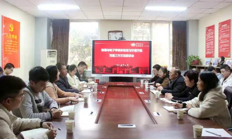 2月23日下午,为加强学院之间的相互交流学习,促进党建工作更好地开展,物理与电子学院党委副书记刘寒冰、大学物理教工党支部书记康缈等一行12人到我院交流座谈。会议在地学楼二楼党员活动室进行,我院党委副书记徐小军、行政教工党支部书记谷蕾,院党办主任、博士生党支部书记时振钦和各研究生党支部书记参加会议。