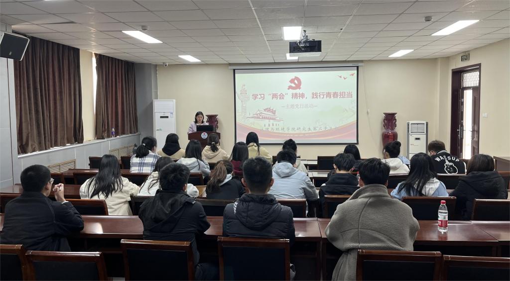 为深入学习宣传贯彻习近平总书记在“两会”期间的重要讲话精神和全国两会精神,以高质量党建引领发展,3月25日,研究生第二党支部于学院二楼报告厅开展“学习两会精神,践行青春担当”主题党日活动,会议由支部书记陆蓉主持。