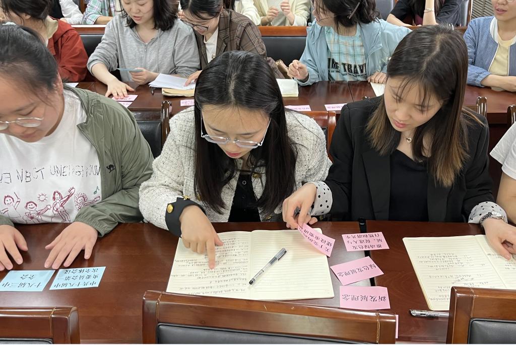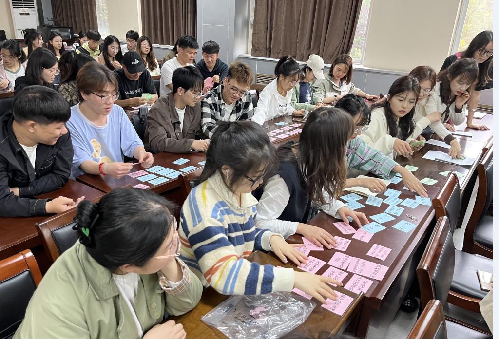 第二环节开展“拼接知识碎片”趣味游戏。游戏开始,学习小组成员段园凯介绍游戏规则,本次趣味游戏准备了三类“知识卡片”:第一类卡片上写着不同的习近平新时代中国特色社会主义思想具体内容;第二类为其对应提出的时间;第三类为提出的会议名称。每组成员需要完成知识卡片的拼接,限时5分钟,在规定时间将三种卡片拼接正确最多的小组获胜。游戏过程中,同学们积极答题,气氛紧张而热烈。游戏结束后,学习小组成员现场对答题结果进行统计,第四小组获一等奖,第七小组获二等奖,第八小组获三等奖。随后,党支部支委为在游戏中表现优秀的小组颁发奖品。