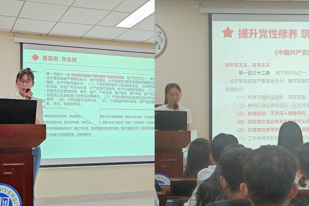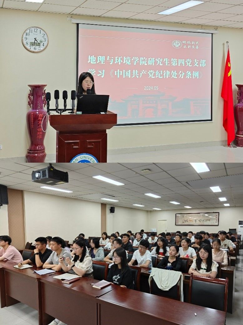 为深入开展党纪学习教育,引导学生党员学纪、知纪、明纪、守纪,牢固树立党规党纪意识,坚守纪律底线。研究生第四党支部于2024年5月27日在地学楼二楼报告厅开展以“严明纪律意识,筑牢思想防线”为主题的主题党日活动。研究生第四党支部全体党员及积极分子参与会议,活动由支部书记卜腾霄主持。