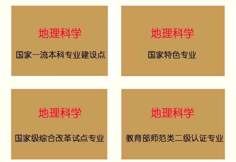 地理科学,国家一流本科专业建设点,国家特色专业、国家专业综合改革试点、教育部师范类二级认证专业。