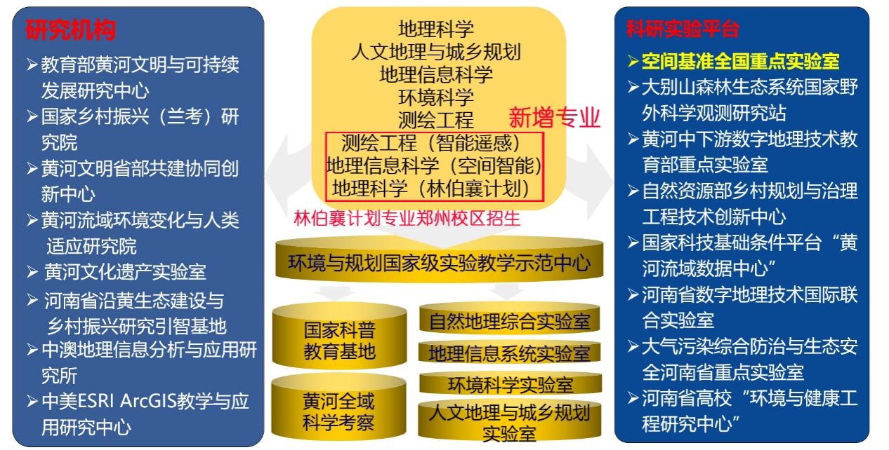 空间基准全国重点实验室、环境与规划国家实验教学示范中心、河南大别山森林生态系统国家野外科学观测研究站、教育部黄河文明与可持续发展研究中心、黄河文明省部共建协同创新中心、黄河中下游数字地理技术教育部重点实验室、国家地球系统科学数据中心黄河下游分中心、国家乡村振兴(兰考)研究院等省部级平台。
