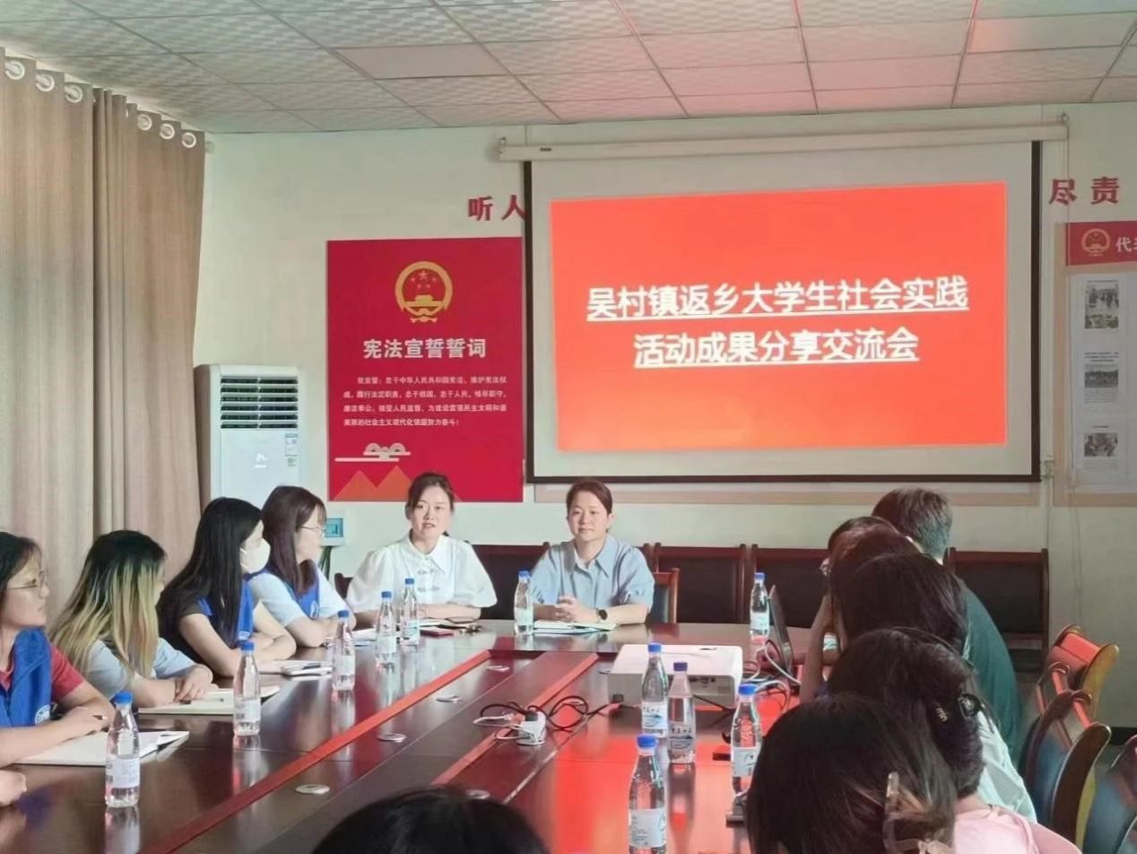 之后,一行人前往吴村镇柳湾村村委会,在此举行座谈交流会议。会议由王镇长主持,镇团委书记李静宜汇报了吴村镇团委工作开展情况,紧接着,由河南师范大学驻村工作队第一书记刘晨生解读村庄发展历程,分享柳湾村这样一个乡村振兴示范村的致富经验。随后,yl23411永利集团官网学生代表分享了参加社会实践活动的初衷、收获和建议。之后镇长孙意慧对大学生在吴村实践期间所作的贡献表示感谢,希望每位同学都能够通过此次实践活动感受乡村振兴的伟大成就,让更多的人了解吴村、走进吴村、融入吴村。
