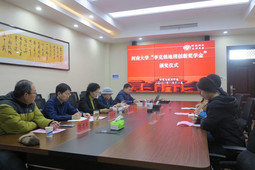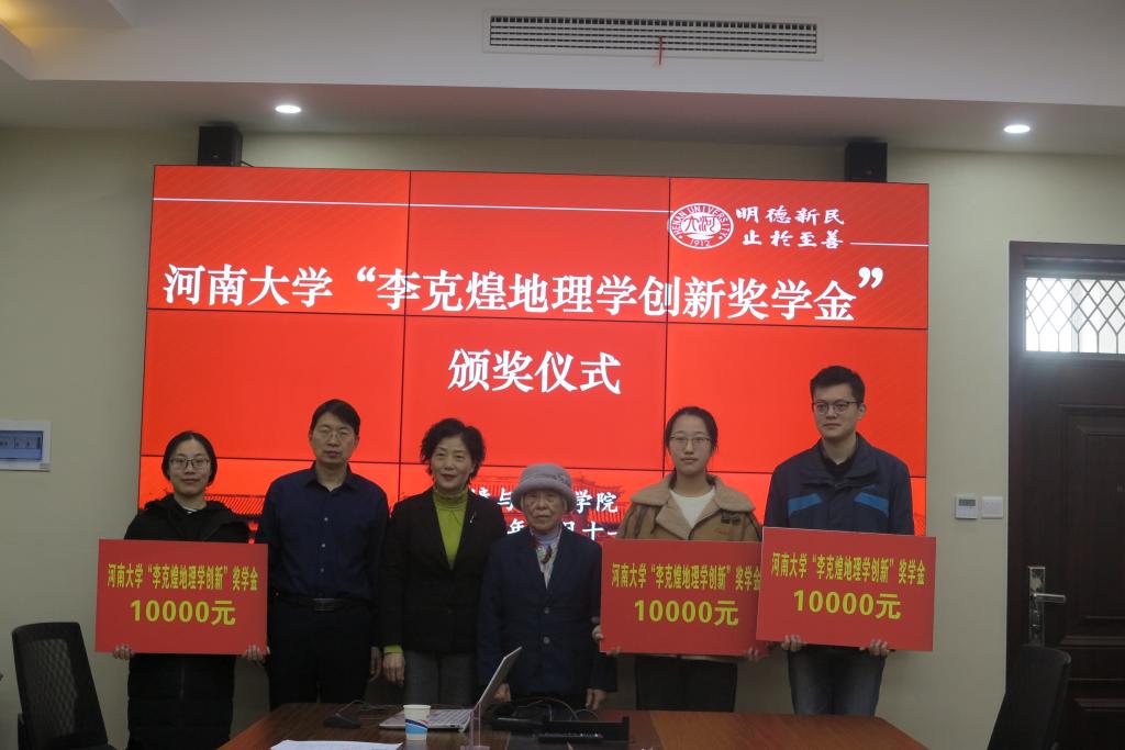 1月11日上午,yl23411永利集团官网“李克煌地理学创新奖学金”颁奖仪式在环境与规划学院301会议室举行。李克煌夫人赵家珍女士、yl23411永利集团官网校友工作与教育发展基金会办公室主任刘波、环境与规划学院执行院长乔家君、党委副书记徐小军、河南省教学名师马建华及获奖学生参加颁奖仪式,仪式由徐小军主持。