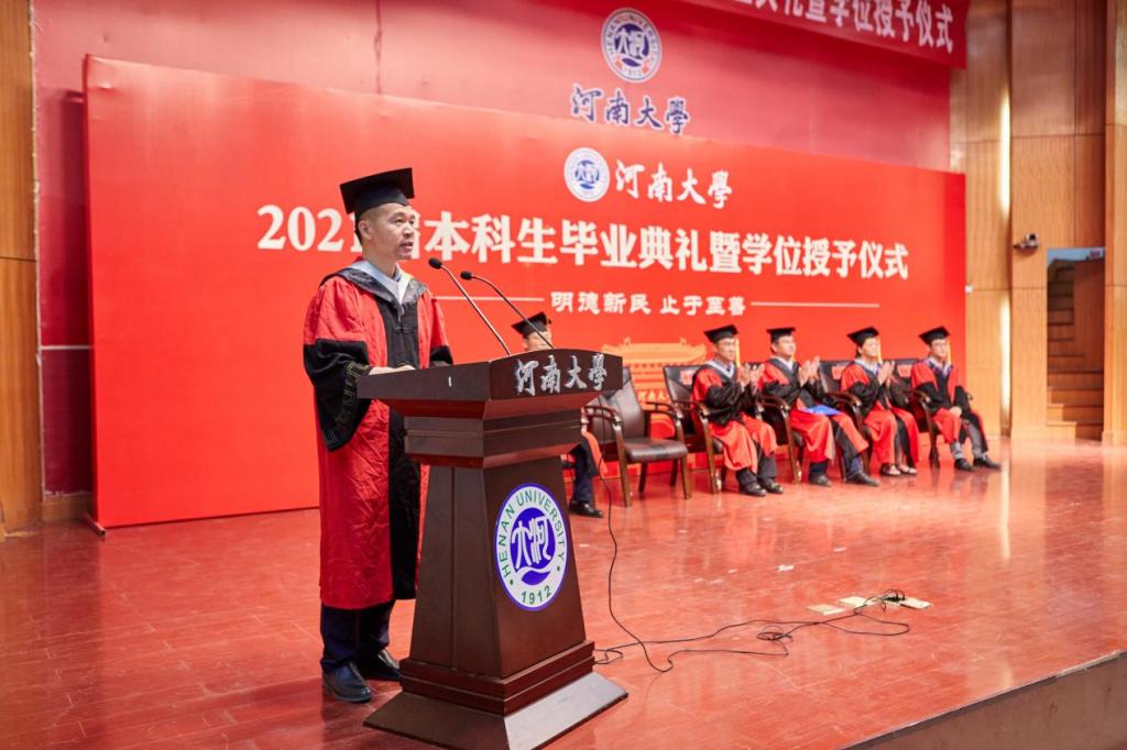 郑洪涛代表学院向圆满完成学业的全体同学表示最热烈的祝贺,他希望同学们都能满怀崇高理想,诚实守信、遵纪守法,在做任何事情的时候都能充满信心,无论何时何地都做一个有决心、有恒心的人,并语重心长地给同学们提出四点嘱托:一要珍惜学业事业,积极为社会做出贡献;二要严守红线底线,走稳人生道路;三要正确认识自己,不断学习提升自我;四要尊重善待他人,努力给养家庭。最后,他祝愿全体毕业生带着母校的思念向更远的未来自在飞翔。
