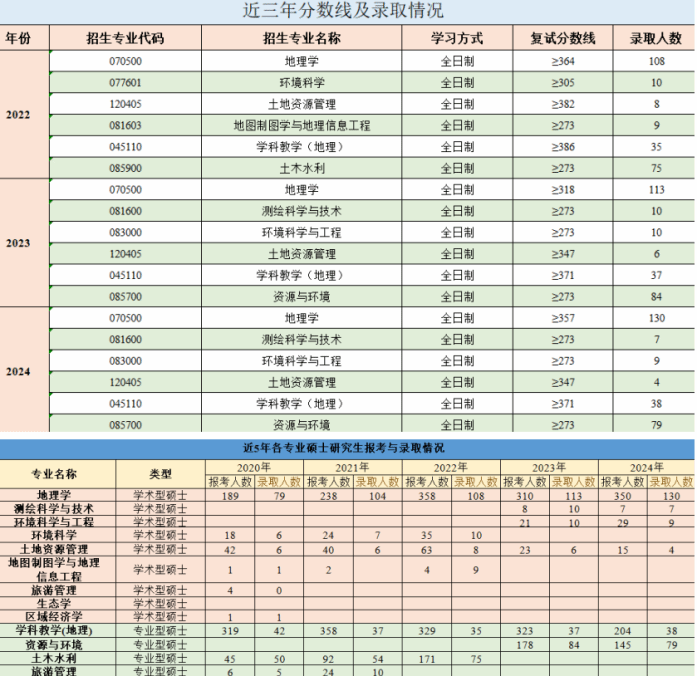 以下是近三年地理与环境学院分数线及录取情况、近5年各专业硕士研究生报考与录取情况。