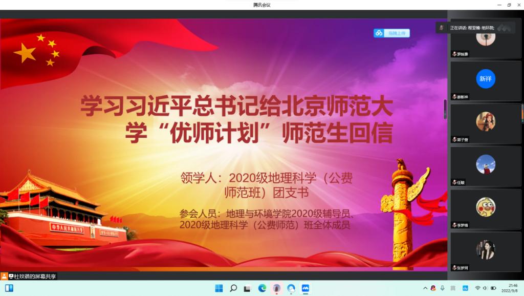 2022年9月8日晚,地理与环境学院2020级师范生依托腾讯会议线上共同学习习近平总书记给北京师范大学“优师计划”师范生回信精神。在团支书杜玟蓓的主持下,同学们进一步了解了“优师计划”,认识到要珍惜时光,刻苦学习,砥砺品格,增长传道授业解惑本领,毕业后到祖国和人民最需要的地方去,努力成为